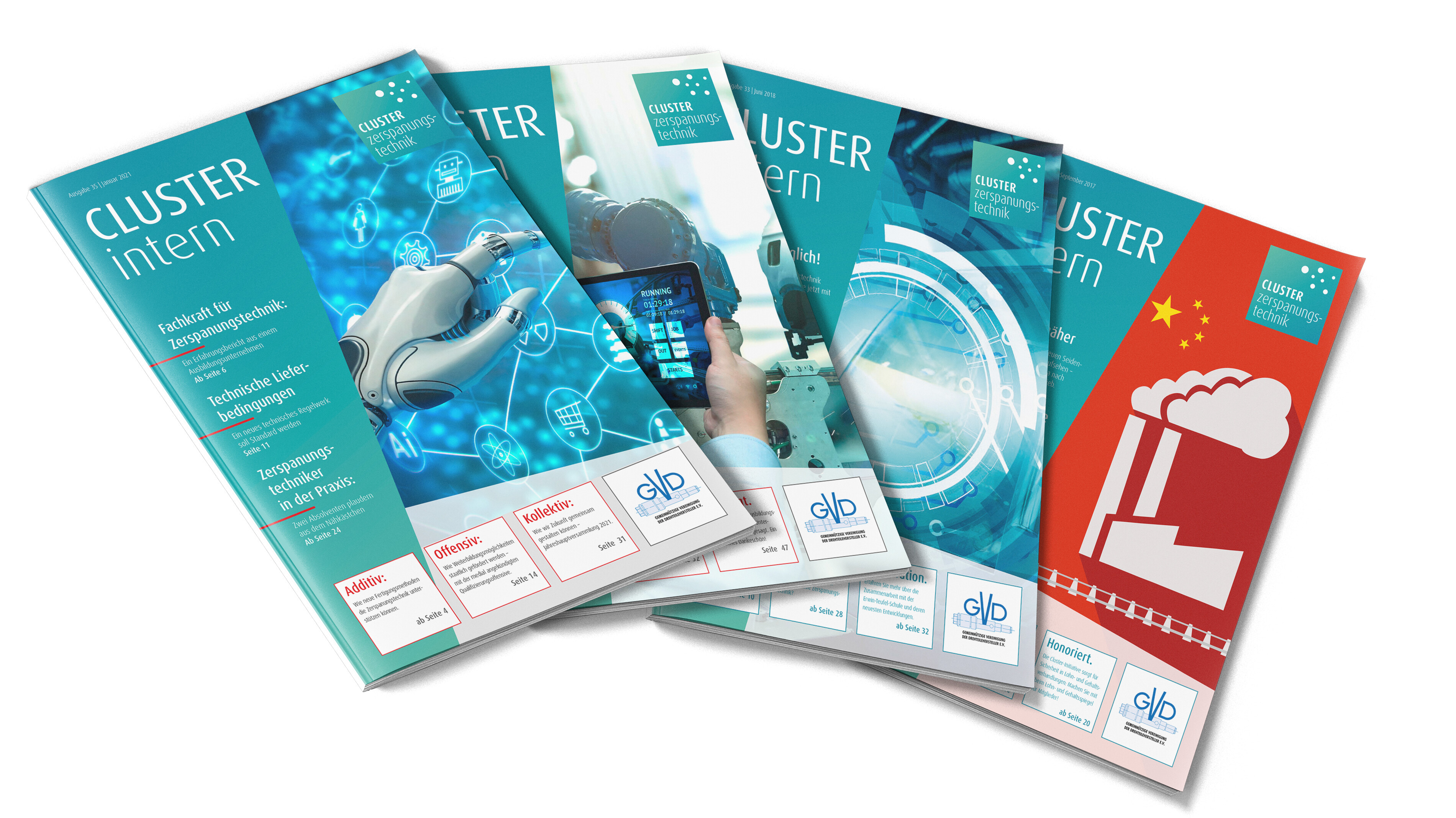 In regelmäßigen Abständen veröffentlicht das Cluster außerdem das Magazin Cluster-intern, in dem Aktuelles aus der Branche und der Region zu lesen ist. Sowohl die Redaktion als auch das Layout verantwortet KMS. Wir führen Interviews mit Fachleuten, recherchieren vor Ort in Unternehmen und Ausbildungsstätten und verpacken alles zu einem ansprechend gestalteten Magazin, damit Mitglieder der Zerspanungsbranche immer auf dem neuesten Stand sind!
